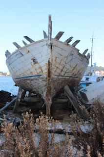 Als wir ein Stückchen weiter gegangen sind, haben wir den Schiffsfriedhof entdeckt. Da lagen einige Boote wohl schon sehr lange. Wir sind um die Boote rum gegangen und konnten unseren Augen kaum glauben. Da lag zwischen all den kaputten Schiffen und Booten unsere Mateo. Wir konnten es nicht glauben, haben wir doch erst im September mit dem Kapitän geredet und ausgemacht dass wir im nächsten Jahr wieder ein Fischpicknick machen.